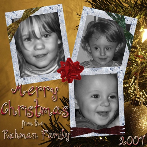 Woohoo! So I finally managed to get a file uploaded so I can share my work. I had to use eSnips to do it, so blah on 4shared, mediafire, and rapidshare. My first freebie is a triple frame cluster in sparkly christmas colors. I hope everyone likes it. I used a ribbon from The Ephemeral Victorian to make the wraps on the frames. It's part of the LO's I made for my sister's christmas page she mailed to everyone.