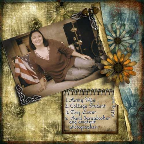 I'm hoping to get a lot more scrapping done after this coming week. Thank goodness finals will be over! Dropping down to one class this coming term so that I can spend more time doing the things I want. Not to mention hubby leaves in a couple months to go to Iraq again (another 15 months down the drain for me) and I really want to spend all the time I can with him. Gotta do something to have kids right?! LOL This last LO was done for a challenge at Treasures To Scrap. The idea was to give the reason you scrap. Here is my LO. I used the Timeless Journey kit by Manuella Zimmerman which is available at Treasures To Scrap. The fonts are also by Heather Stokes. These are all awesome designers and you should check them all out. It's well worth it. You should also check out Treasures To Scrap. They have an awesome gallery and feature not only digi-scrapping, but also hybrid and paper scrapping as well. This is one fun group of people and the forums are always hoppin! Check it out!